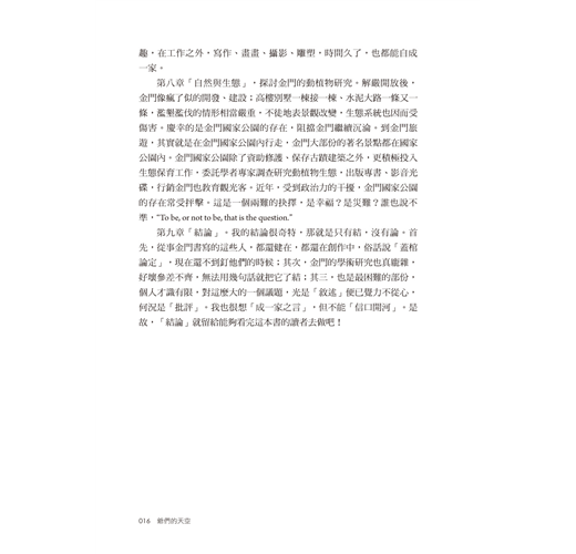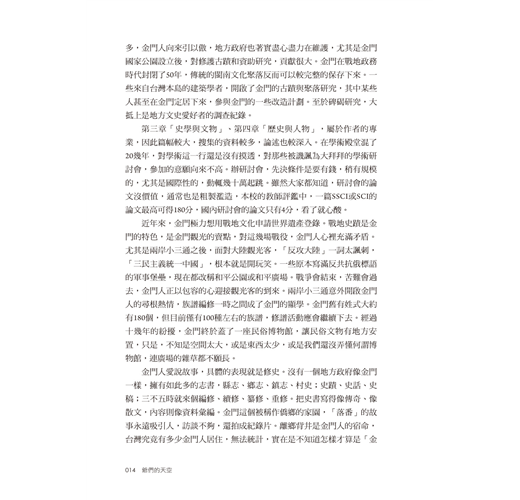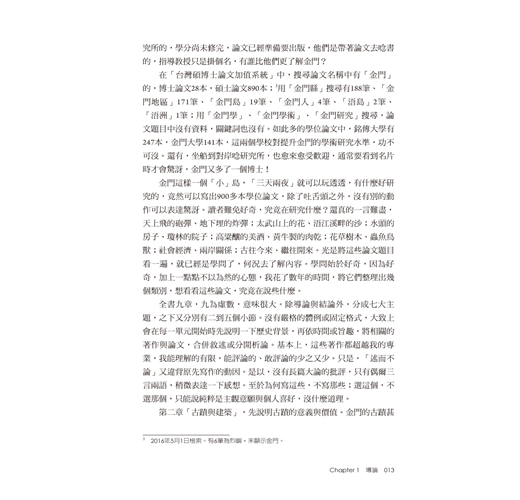 至於能成就多大的學術價值,我沒那麼在意。但我仍然期盼這是一本好書,值得花時間去讀,畢竟我對書中內容用情既深且久,知我者必可在此書中看到我存在的影子;不知我者,也可經由此書一窺金門豐富的內涵。最後,感謝書中被論述的鄉賢前輩、學者專家,金門因你們而偉大,你們是金門真正的財富,言詞若有不敬,請一笑置之。