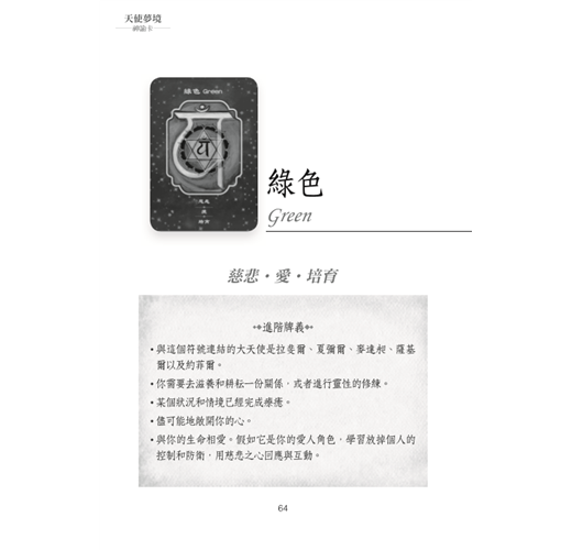 這套牌卡同時適用於初學者和專業的解夢行家。加上有天使的協助,你更能順利實現內心的想望。由於這套牌卡具有神諭占卜的功用,因此你將會學習到一些基本夢境符號的象徵意義。比方說,假如你的夢中出現綠色,你可以藉由注視著「綠色」這張牌,然後翻看手冊當中的牌義說明,來學到關於這個顏色的各種象徵意義。