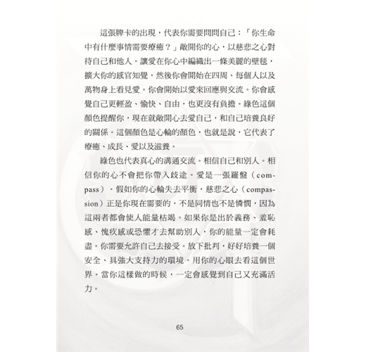 將整副牌握在你非慣用的那隻手上(通常是你不用來寫字的那隻手)。觀想有一道白光,從你的頭頂向下灌注到你的心臟、經過你的手臂、一直到達你的手掌。用你的另一隻手在整副牌卡上輕輕掃一下,觀想這些牌卡所攜帶的能量都被沖刷到牌卡下方的一艘小船裡,或者你可以想像任何一種你喜歡的容器,讓它來接收所有來自這副牌卡的能量。這個容器會將所有能量轉化成愛與光。當你完成牌卡的淨化之後,你也同時給了它們新的能量。