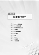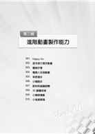 3.操作題型範例題目提供4大類40題,教您由淺入深的學習Flash CC最新之功能,包含「角色製作能力」、「動畫製作能力」、「進階動畫製作能力」及「多元應用設計能力」,以實際作品範例透過設計功能剖析,提供讀者在解題過程中學習Flash CC最實用的技巧,提升動畫設計能力。