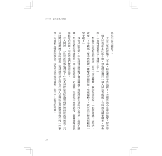她跟大多數的脊椎傷者一樣,受傷存活後的上半場人生,都在不斷尋找方法、不斷地尋找機會自殺。因為她們堅信──這才是一劑最好的療方。所以,她自殺過好幾回。前面的故事對象說的都是女性,但自殺成功率最高的卻是男生,且是相對年輕的男生。這個數據也可以這樣去理解:女性比男性堅韌、男性養家的社會壓力大、年輕人滿腔熱血、夢想幻滅後無可忍受的悲憤。而臺灣每天因脊髓受傷平均一天三個,年齡層大多在二十七歲左右,更凸顯了這個數據背後的高度張力。