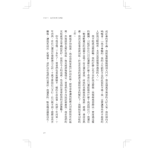 一路走來,我學到了很多,也經歷不少挫折,從失落、打擊、失敗到振奮,這當中我體會到人對於生命的堅持與環境的改造,壓力越大,求生意志就必定越堅強,應變能力也越驚人。所以像我這樣經歷過艱辛與患難的人,不但有警惕、激勵他人的作用,也讓自己更能禁得起磨練與考驗。