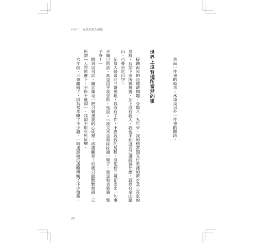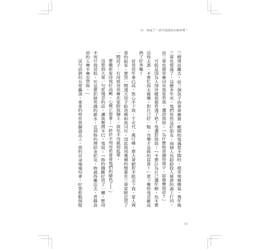 記得大姊曾向三哥提起,我沒有工作,不要收我的房租。沒想到三哥卻丟出一句事不關己的話,真是出乎我意料。他說:「我又不是和妹妹過一輩子,我是和老婆過一輩子呀!」