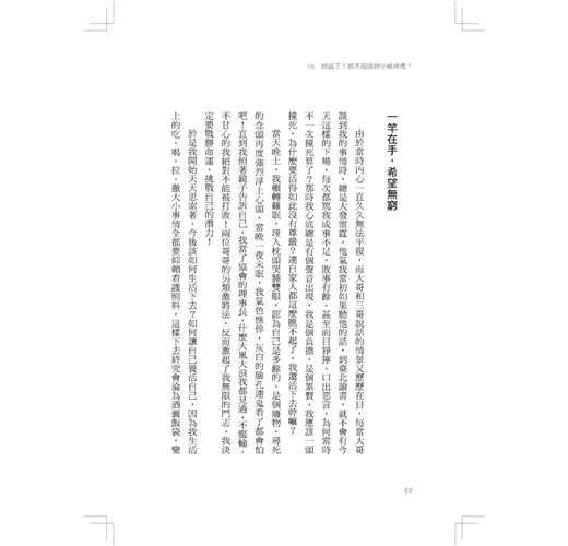 打開後原本只想隨意瀏覽而已,想不到選美佳麗們的自述故事,卻讓我不自主地逐漸深陷。因為,每一則故事都是一場張力十足、驚心動魄的生命歷程,從正常到癱瘓,或因脊椎病變、或因一場車禍,接著歷經手術的折騰、漫長的復健、經濟的窘迫、夢想的幻滅、感情、婚姻甚至連動到家庭的動盪、丕變……這幾乎都是她們生命裡共同的戲碼,上一場身、心痛過了,又有下一場在等著。正如當晚外頭的強風驟雨,一陣陣的又颳又打,永不停歇一般。那本雜誌我就這樣讀著……嘆著……,看完,已是深夜。