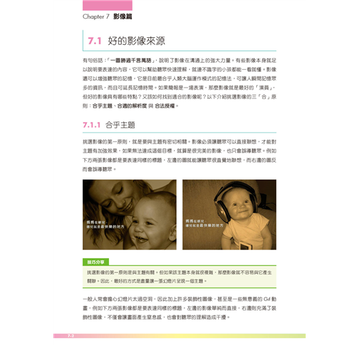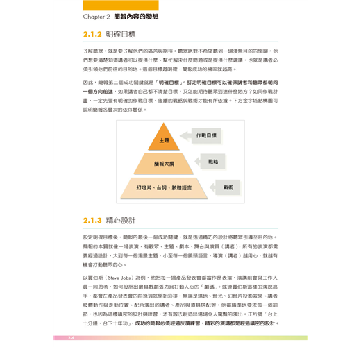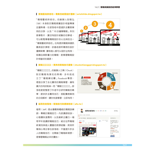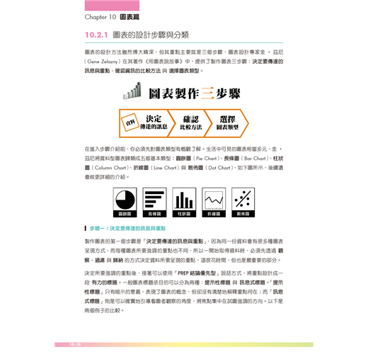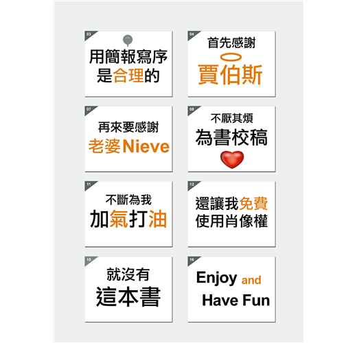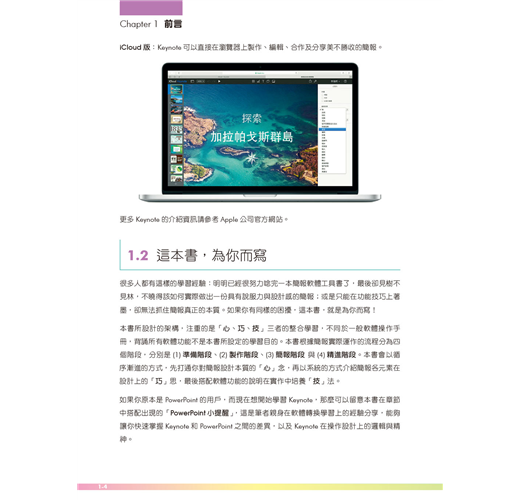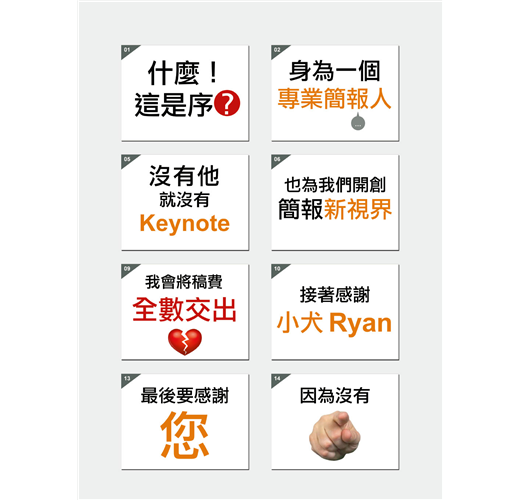本書注重的是「心、巧、技」三者的整合學習,不同於一般軟體操作手冊,背誦所有軟體功能不是本書所設定的學習目的。本書根據簡報實際運作的流程分為四個階段,分別是(1)準備階段、(2)製作階段、(3)簡報階段 與 (4)精進階段。先打通您對簡報設計本質的「心」念,然後透過有系統的方式,介紹簡報各元素在設計上的「巧」思,最後搭配軟體功能的說明,從實作中培養「技」法,讓您做出抓住眾人目光且具說服力的簡報。
