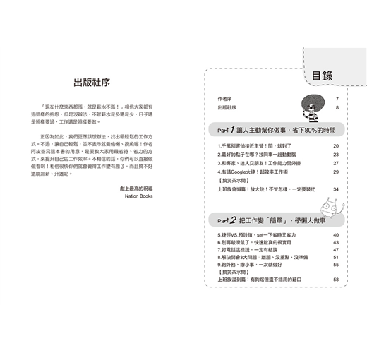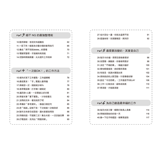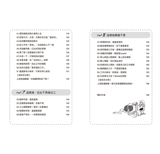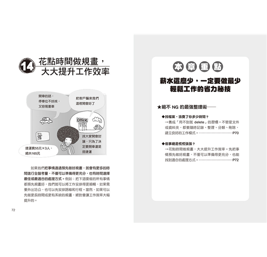 本書介紹 66 個輕鬆工作的省力祕技,這些祕技都非常實用,在職場上絕對可以派得上用場。其實,有不少技巧是我們原本就知道的,只是很容易被忽略掉,例如:做筆記、複誦對方的話、尋求別人的意見等等,希望大家可以按照這些方法去做做看,你就會發現真的有輕鬆就能讓工作順利完成的辦法。