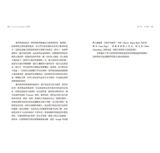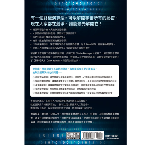 「多明戈斯絕對是一位親切且有趣的知識導師,他能用最淺顯易懂的語言,通透解釋這些艱澀難懂的機器學習理論學派知識領域,協助初學者快速領略這演算法,可謂近幾十年來難得的經典之作……這是一本理論完整與實務說明詳實的書籍,不僅能滿足單純好奇的初學讀者,更是適合早已具備基本機器學習領域知識的專業人員,更能融會貫通此領域的重要神髓。透過每一篇章的學理翔實描述和討論,淺白解釋難懂的術語,以及提出明確與易於理解的實例,這些努力都是本書最值得推薦讚揚之處。」──《英國泰晤士高等教育專刊》(Times Higher Education)