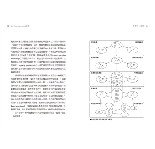 每年數以百計的創新機器學習演算法被發明出來,它們都是基於環境需求被推衍開發出來的。而這些都是這本書所要探究的,它們也正是你需要知道的,以便了解機器學習是如何改變這個世界。本書不會深奧難懂,撇開它們在電腦裡的程式細節,這些機器學習演算法處處關係到我們每個人心中期待理解的問題答案,例如:機器是如何學習的?有沒有更好的方法?機器可以預測什麼?我們可以信任機器學過的東西嗎?針對這些問題,每種競爭的思想學派,在機器學習的思維上都有著南轅北轍的答案。主要的思想學派共分成五個,我們將為每個學派開闢一個章節專門介紹。符號理論學派(Symbolists)將學習視為是一種逆向演繹法,是從哲學、心理學和邏輯思路方面取得概念。類神經網路學派(Connectionists)會進行大腦的反向工程(reverse engineer),主要是受到神經科學和物理學的啟發,模擬人腦思考行為。演化論學派(Evolutionaries)會在電腦上模擬演化演變,澈底運用遺傳學(genetics)和演化生物學(evolutionary biology)理論。貝氏定理學派(Bayesians)相信學習是機率推理的一種形式,是根據統計學做為理論的依據。而類比推理學派(Analogizers)則是透過從相似度判斷進行推論學習,並且受到心理學和數學的最佳化影響。在建構智慧機器的目標推動下,我們將綜觀回顧近百年來許多學派的思想史部分,並且看見其一線新曙光。