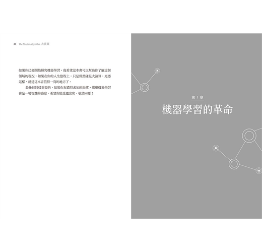 如果你是一位機器學習專家,你應該已經很熟悉這本書中大部分涵蓋的內容,但是你仍然會在這本書中找到許多新的想法、機器學習發展史上有價值的資訊,以及有用的案例與類似的情境。最重要的,我希望這本書可以提供機器學習的嶄新觀點,甚至可以啟迪你全新的思考方向。雖然我們的身邊到處都是唾手可得的果實,而且我們應當去撿拾這些果實,但我們也不應該忽視等待在後面的更大獎勵。關於這點,我希望各位可以原諒我的放肆,使用了「大演算」一詞來代表通用的學習器。