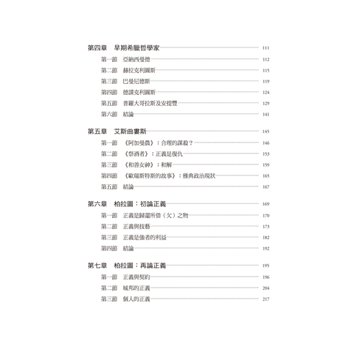 書中涉及的文本涵納文學、戲劇及哲學,探討荷馬、赫希俄德、立法者與輓歌詩人、早期希臘哲學家、悲劇作家艾斯曲婁斯、柏拉圖及亞里斯多德等先賢的正義觀,希望帶領讀者從其優美的文字、動人的故事及崇高的理想中,反省我們的生命現況,妥善回應當前面對的倫理難題。