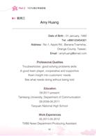 Resume是你的技能、經驗和教育的總結,通常為一頁不超過兩頁,履歷的筆調是很簡潔並且精確的,如果你有太多的學經歷、活動經驗,那麼就盡量放與你應徵職位有相關的經歷。既然叫做簡歷,不會有人想要看你歷年來做過全部的大大小小的事情或成就,挑幾個重要的來寫即可。