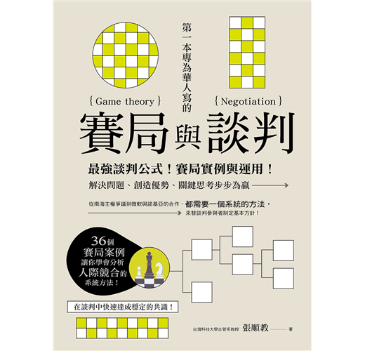 但我必須承認的是,談判賽局是一種整合了賽局理論與分析工具的應用、談判認知心理學,以及各種溝通與表達技巧等專業知識的應用,若再加上在各種領域(如法律、經貿、政治、商業交易等)的應用知識,談判賽局對任何人而言,都有很大的學習空間,甚至窮盡一生的光陰,也只能說學習、學習、再學習。所以此書對我而言,或許只是個開端,希望在日後的教學和學習過程中,能激發出更好的內容或知識跟讀者分享。