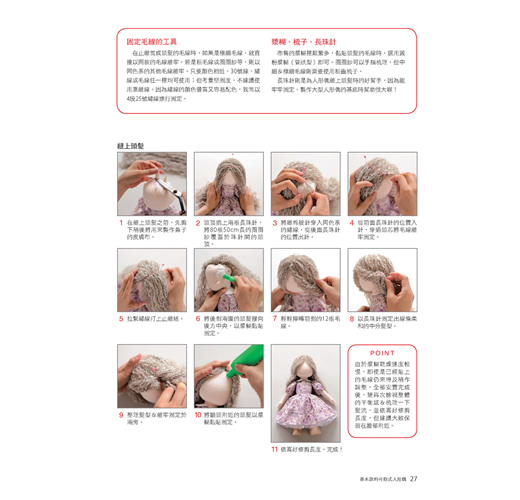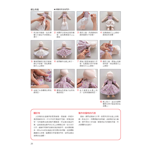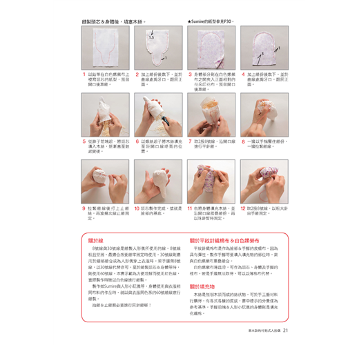 以此四種基本作法即可作出布置擺飾、陪伴娃娃、換裝娃娃等不同的類型,且針對不同的作法皆以詳細的分解步驟圖進行示範解說;從人形偶主體的製作、充棉&身體組件的接連方式、頭髮造型&臉部表情呈現,到衣服的縫製&接縫皆有教作。請跟著作者的詳細解說&重點提點進行縫製,作出專屬於你的可愛人形偶吧!
