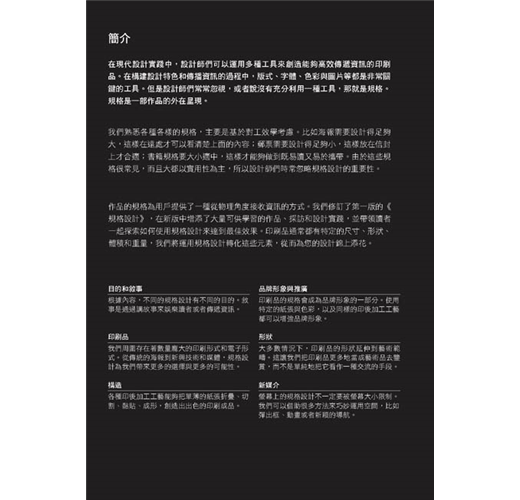 在現代設計實踐中,設計師們可以運用多種工具來創造能夠高效傳遞資訊的印刷品。在構建設計特色和傳播資訊的過程中,版式、字體、色彩與圖片等都是非常關鍵的工具。但是設計師們常常忽視,或者說沒有充分利用一種工具,那就是規格。規格是一部作品的外在呈現。