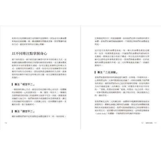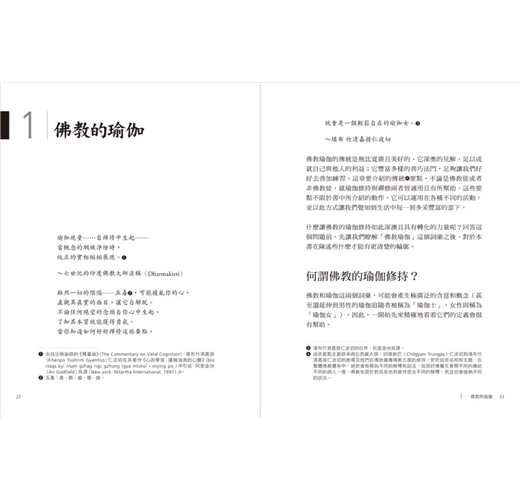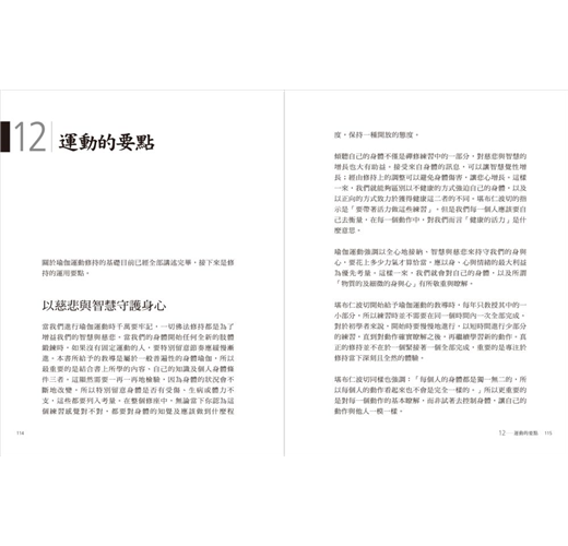 本書不僅提供初學者一個完整的學習基礎,對於已經從事任何形式的瑜伽修學者,可以讓禪修與身體動作更深入更緊密地結合,內容包含佛教瑜伽修持獨特的見地,以及座上修時如何運用身與心方面的指引,接著更進一步以生活中的種種逆緣如病痛、恐懼、焦慮、拖拖拉拉等,作為進階的修持方法,最後有完整的瑜伽運動說明及示範,並以照片加以詳述。