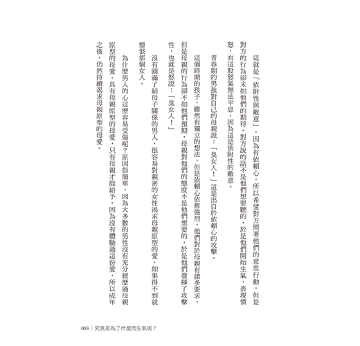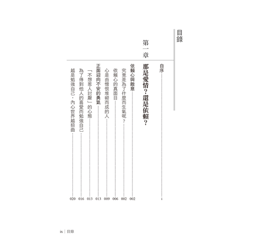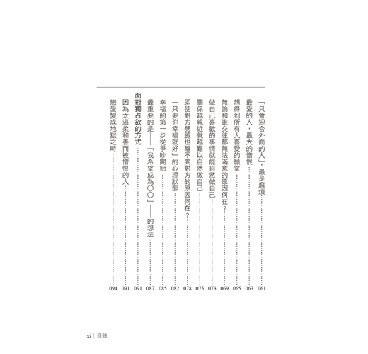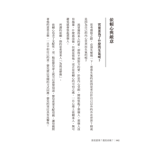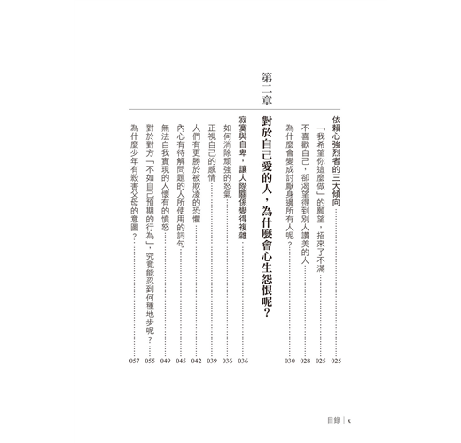 本書介紹的憎恨屬於後者。第一章、第二章、第三章,主要介紹源自於依賴心的憤怒。第四章陳述的內容則是對於演變至此的自己,重新審視自己一路以來的成長過程。