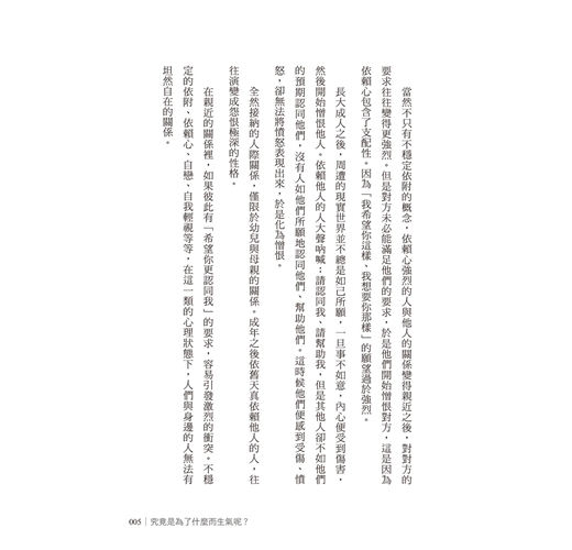 為了他人的言行而動怒、沮喪,背後的原因雖然形形色色,但是其中主要的原因之一,在於當事人自己的依附需求。