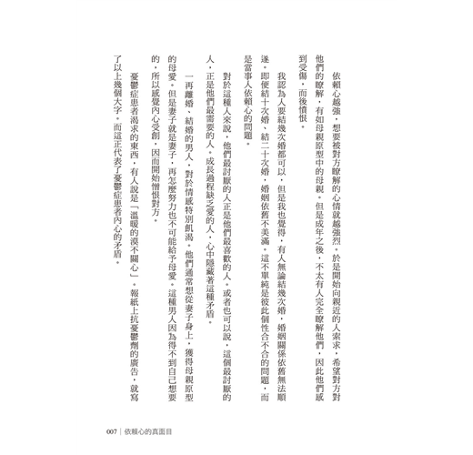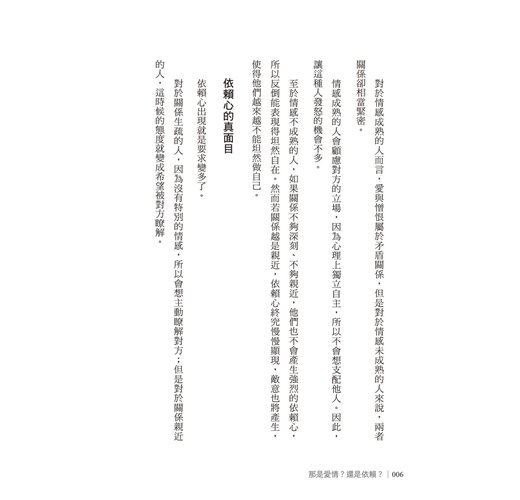 至於情感不成熟的人,如果關係不夠深刻、不夠親近,他們也不會產生強烈的依賴心,所以反倒能表現得坦然自在。然而若關係越是親近,依賴心終究慢慢顯現,敵意也將產生,使得他們越來越不能坦然做自己。