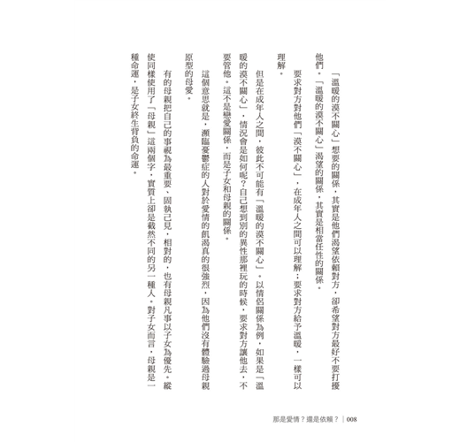 但是在成年人之間,彼此不可能有「溫暖的漠不關心」。以情侶關係為例,如果是「溫暖的漠不關心」,情況會是如何呢?自己想到別的異性那裡玩的時候,要求對方讓他去,不要管他。這不是戀愛關係,而是子女和母親的關係。
