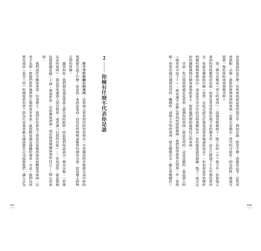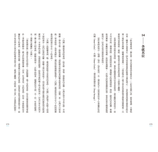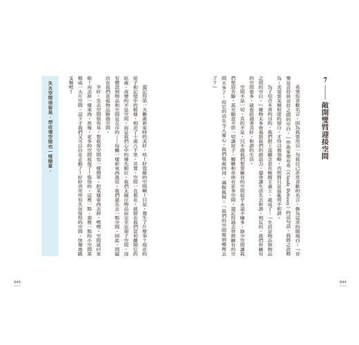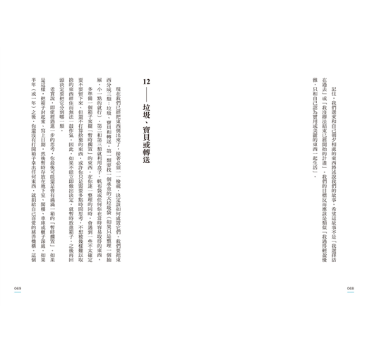 創造出家中的空間,我們才能專注在對的地方──關心我們做的事,而不是擁有的東西。生命太短暫,不該浪擲在物品上。滿頭華髮之際,我們吟詩作對的內容不會是我們擁有過什麼,而是自己曾經在物品與物品之間的空白處所經歷的點點滴滴。