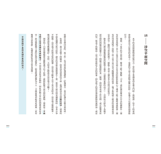 別害怕!只要改變態度並嚴格遵守以下原則,就能征服平面空間的雜物,那就是:平面空間不是用來儲存東西的地方。平面是用來從事活動的,因此活動之外的時間應該保持淨空。把這個極簡主義的原則付諸實行,結果將讓你驚為天人,不僅家裡看起來更清爽、更有條理且更寧靜,也變得極好利用且容易清理。