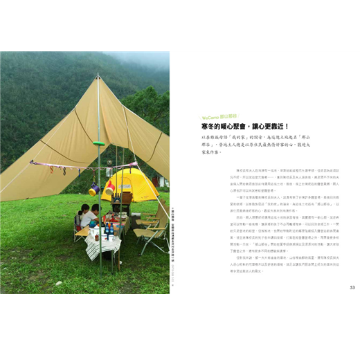 2.介紹時下最流行、最實用的露營裝備:最輕便的露營裝備一次報你知!從營帳材質、必備的基本工具挑選,乃至於哪些營地適合自己全家人出遊?如何在野外變出一桌好料?露營新手最擔心的問題,一次全部解決!