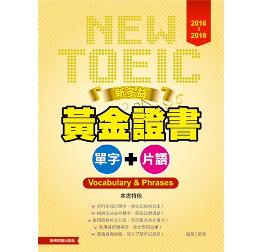《新多益黃金證書單字片語》和《新TOEIC單字完全攻略》最大的不同之處為新增許多實用的商務英文片語和表達方式。透過英文解釋和實用例句,不但能讓讀者完全掌握片語意義,更能知道如何實際應用在日常生活上,全面提升英文實力。