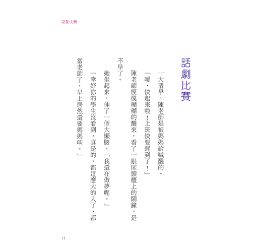 學校要舉辦話劇比賽,班上同學都熱中參與話劇比賽的選題、分配角色,中間發生了不少風波,也鬧了不少趣事。誰知比賽前一周,劇目與他班相同,不管是第幾個出場,一班和二班由於同劇目,所以,只要是緊緊挨著對方出場,這都是一個最糟糕的結果!於是,在全班同學一起動腦筋、一起集思廣益的情況之下,一個嶄新的故事很快就誕生了。大家也都有共識,不管比賽結果最後有沒有得獎,他們已經充分展現了合作精神了。