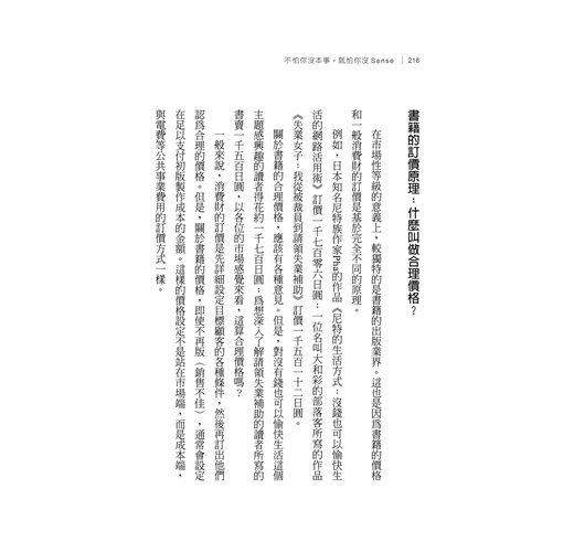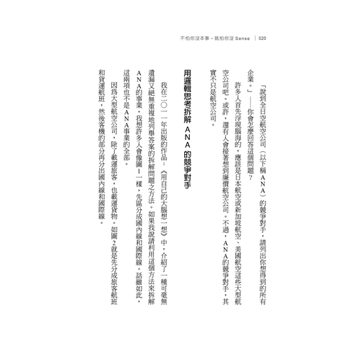 作者在篇章裡,透過舉出各種細膩又生活化的例子,協助讀者該怎麼思考與強化邏輯,探討生活、產業、職場生態,甚至是個人生命中的重大抉擇與學習等,令我們運用一個全新角度,重新思考問題的本質。