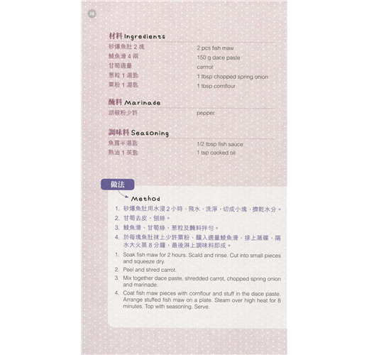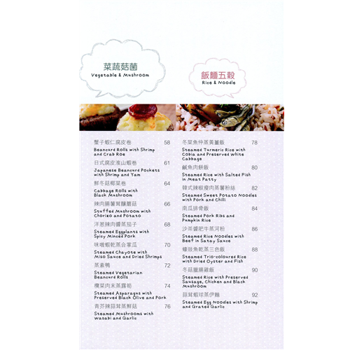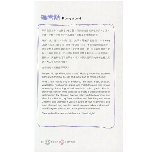 蒸餸健康又簡單,更可吃出原味,很多人都喜歡。本書向家傭介紹用最簡單的蒸法,也可吃出特色蒸餸,毋須太多額外的調味料,以天然的香辛料烹調,美味之餘也最合現代都市人健康需要。