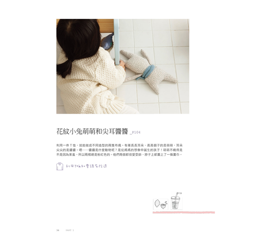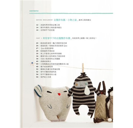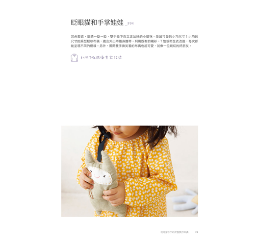 打開衣櫃,尋找改造素材!條紋T恤做成貓咪娃娃,針織圍巾做成愛哭包玩偶,有扣子的襯衫做成熊叔叔……充滿回憶、捨不得丟棄的舊衣,親手賦予它新的生命面貌,將美好過往改良為世界上獨一無二的布偶,繼續訴說更多故事吧!
