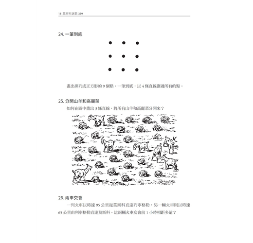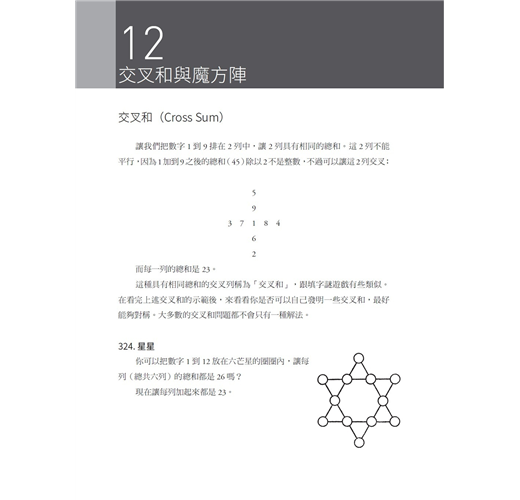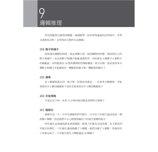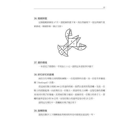 1. 多元題型:本書包括從故事中發掘解題線索、圖形排列、分數及代數計算、邏輯思考等10幾種問題類型,滿足各種解謎的愛好。