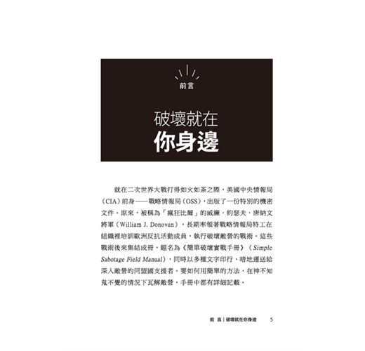 這些深具破壞力的行為其來有自,而且歷史悠久,是美國中情局(CIA)前身──美國戰略情報局(OSS)在二戰時,用來指示特工深入敵營暗中大搞破壞的戰術。這些行為表面上具有高度的正當性(誰能說「請示主管」或「開會」是錯的呢?),因此就像病毒一樣,殺傷力十足,能有效癱瘓敵軍效率,也幾乎無法預防。