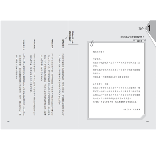 本書的「收文籃」模擬試題,以虛擬角色帶領你走入一家千瘡百孔的公司,讓你以總經理的身分,面對不同領域的經營管理難題,思考如何做出明智的決策。