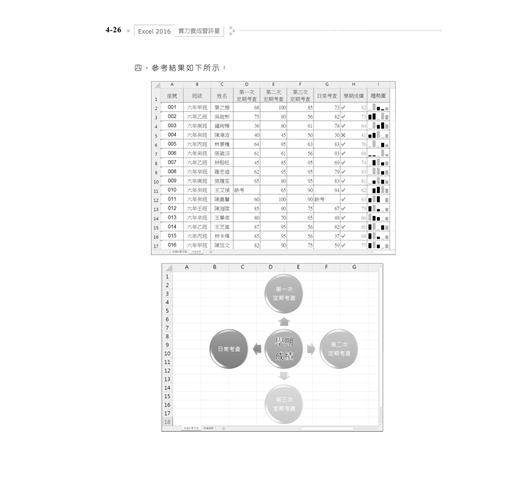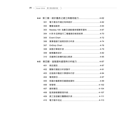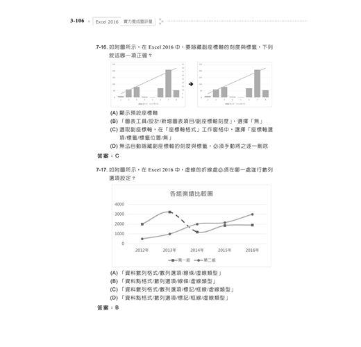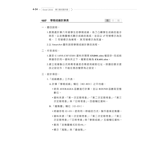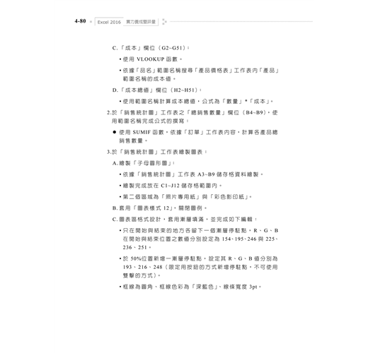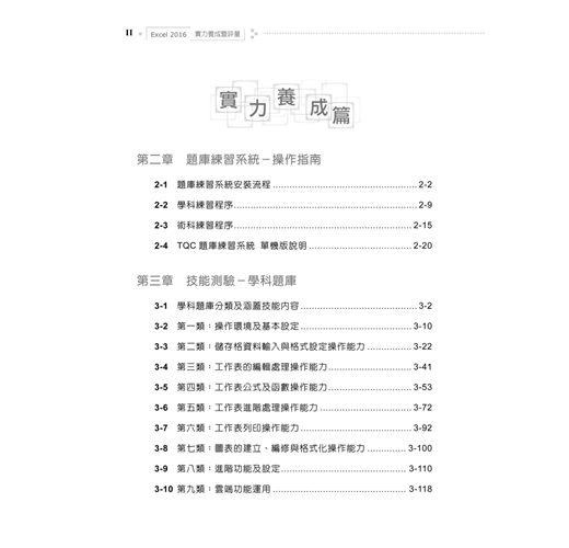 2. 囊括Excel 2016最常用之功能,學、術科題目淺顯易懂,豐富且多樣化,讓讀者能夠循序漸進的學習,熟練Excel軟體的操作。