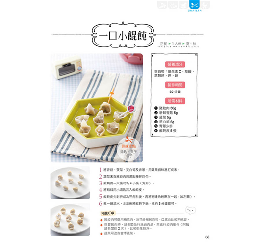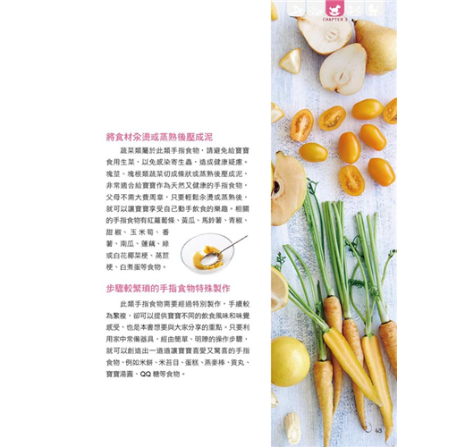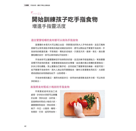 順應時節,選擇當季蔬果食材,並依成長階段設計適合寶寶的手指食物,可以訓練手眼協調、咀嚼能力,也是培養自行用餐成就感最棒方式。讓孩子樂在主動進食,自己用手抓,使用湯匙、叉子、筷子方法對了,孩子自然就能學會。
