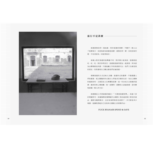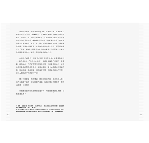 在西方社會裡,有所謂的Gap Year(在畢業以後,投身社會以前,出走一年)──Gap Year中人,多數身無分文,胸前的盾牌是青春,所有的「錯」都在一年內犯齊,人生路向盡可能在同一年辨清。可惜,我們沒有Gap Year的習慣,大學畢業生沒有,中五輟學生更沒機會擁有。就此,我們缺乏因為年少輕狂而別有一番風味的體驗:在異地放肆買醉、在寒冷的營地中生火失敗、到只認識半天的「朋友」家借宿、提著背包在公路旁呆等三小時便車……窮遊的體驗是重要的,它奠定一個人認知旅遊的方式。
