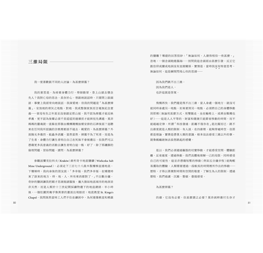 參觀波蘭克拉科夫(Kraków)維利奇卡地底鹽礦(Wieliczka Salt Mine Underground),必須走下三百七十八級木製樓梯直達地底。下樓梯時,我向身後的朋友說:「多幸福,我們多幸福,在矯健時來了該來的地方,時、地、人,所有東西都對了。」不出數分鐘,奇妙的鹽洞讓我把剛才思緒拋諸腦後。龐大猶如地底城市的地洞並非天然,而是人類於十三世紀開採礦物遺下的地底網絡,半小時後,一個壯麗到幾乎像異景的畫面出現眼前:地底教堂St Kinga’s Chape1,我問既然當時工人們不住在礦洞中,為何建築教堂和精緻的鹽雕?導遊的回答很妙:「無論如何,人總得相信一些甚麼。」忽地,一個念頭跑進腦海──別問我這念頭經由甚麼引發,反正它跟信仰或鹽或地洞沒有直接關係,實情是:當時我沒有特意思考,無論如何,這是瞬間閃現心坎的思緒──