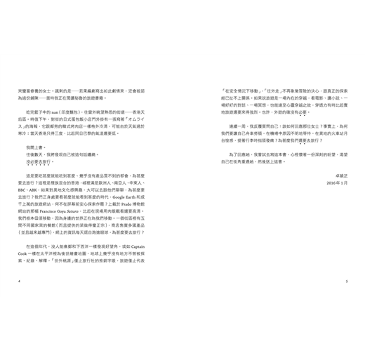 在這個年代,沒人能像鄭和下西洋一樣發現好望角,或如Captain Cook一樣在太平洋裡為後世繪畫地圖,地球上幾乎沒有地方不曾被探索、紀錄、解釋,「世外桃源」僅止旅行社的推銷字眼,旅遊僅止代表「在安全情況下移動」,「往外走」不再象徵冒險的決心,跟真正的探索已經扯不上關係。如果說旅遊是一場內在的穿越,看電影、讀小說、一場好好的對話、一場冥想,也能達至心靈穿越之效,穿透力有時比起實地旅遊還要來得強烈。也許,外遊的確沒有必要。