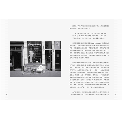 美國街頭攝影師格瑞溫諾葛蘭(Garry Winogrand)這番話比較接近事實。人們提起相機的舉動,來自一種自身經驗能夠被呈現的欲望,渴望透過照片把凌浮空中的體驗具體呈現,就像我們試著透過言語解釋複雜的心情,或透過故事來表述意味深長的意象。人們拍照,企圖複製自身感受,讓自己感到一切能夠定性和詮釋,這份欲望是原始的。我想起小時候,只要同學忽然開始跑,我就會立即起跑去捉住他,完全不為了甚麼。