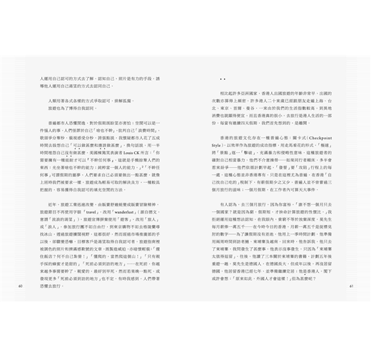 在港人的印象裡,旅遊是必須透過辛勞工作才能獲得的權利──我們經常說:「沒錢怎去旅行?」旅遊首先讓我們想到的,是金錢。既然如此,人們更希望用最短的時間、到訪最多的地方,這意味著用最少的價錢求得最多,順理成章地,關卡式旅遊成為普遍心態。追求速度,不求深度,因為沒有時間,也就缺乏細味的空間。有時人們忘記了自己經已下班。