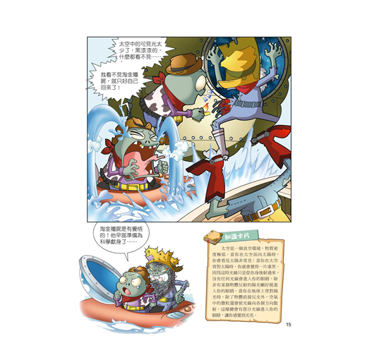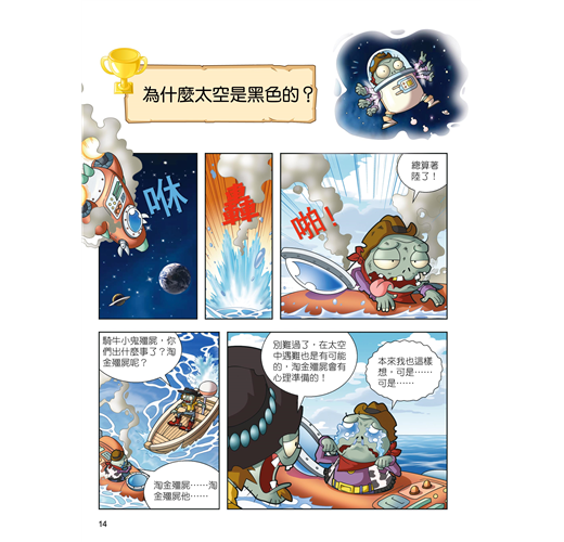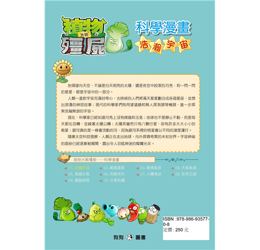 科學系列以植物和殭屍們無厘頭的搞笑生活為主軸,深入淺出探討日常與科學相關的有趣新知。本書利用問答及短篇漫畫的形式,配合知識卡片的解說引導,逐漸揭露浩瀚宇宙的神秘面紗。