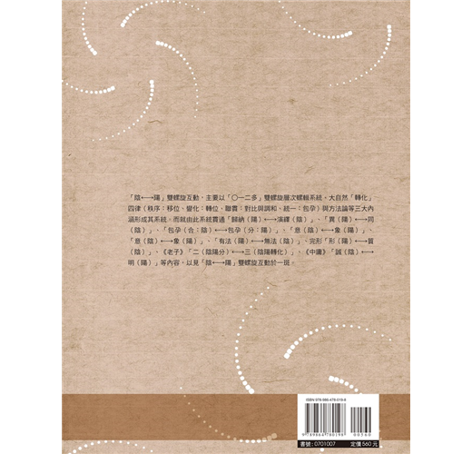 「陰←→陽」雙螺旋互動,主要以「0一二多」雙螺旋層次螺輯系統、大自然「轉化」四律(秩序:移位、變化:轉位、聯貫:對比與調和、統一:包孕)與方法論等三大內涵形成其系統。而就由此系統貫通「歸納(陽)←→演繹(陰)」、「異(陽)←→同(陰)」、「包孕(合:陰)←→包孕(分:陽)」、「意(陰)←→象(陽)」、「意(陰)←→象(陽)」、「有法(陽)←→無法(陰)」、完形「形(陽)←→質(陰)」、《老子》「二(陰陽分)←→三(陰陽轉化)」、《中庸》「誠(陰)←→明(陽)」等內容,以見「陰←→陽」雙螺旋互動於一斑。