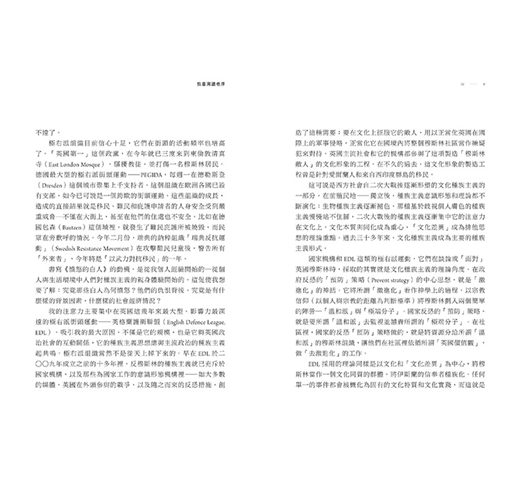 我是英國的第一代移民,在這個國家沒有任何親戚,更沒有文化根源可言。因此,作為一個在英國之外出生、至今仍在學習此地社會與文化的移民來說,我總是對這些種族分子完全缺乏自覺的表現感到驚異。英國媒體只將他們描繪為「一群惡徒」,彷彿這能解釋一切。即便他們在電視與報紙頭版的臉孔展現出那麼深刻的憤怒、仇恨,以及最顯著的—疏離,卻從未有人試圖解釋他們的行為。我不相信人有所謂天性或無法改變的認同。一定是這樣的吧,我告訴我自己,沒有人生來偏頗,對任何種族╱民族的仇恨都是後天習得的行為。所以,究竟是什麼條件促使他們採取了這種思維模式?