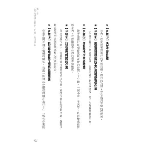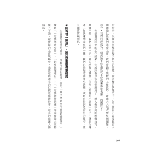 本書羅列的技巧當中,也有所謂的祕技,例如「無法準時交件時該怎麼辦?」像是「一定要準時交件」、「切莫延遲進行」、「一定要戰勝誘惑」等等理論大家都懂,不過,在實際的工作現場中,光靠這些漂亮的口號也無濟於事,這真的讓人很傷腦筋。