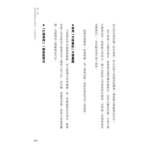 一個重點是快速寫筆記,另一個重點是事後閱讀時,能夠立即回想起內容。