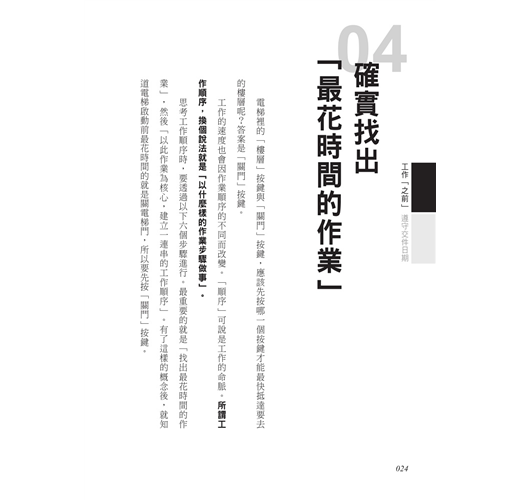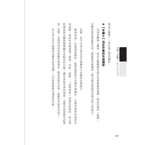 如果在日常生活中就養成這樣的思考習慣,工作時就能立刻意識到作業的順序,並且做出適當的安排。