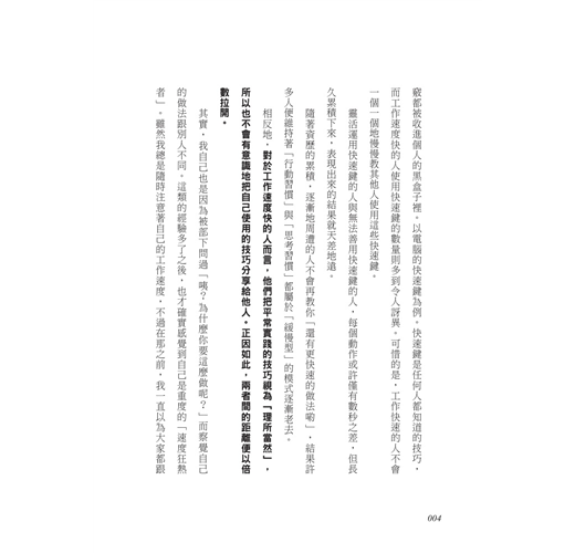 本書把加快工作速度的各種訣竅拆解為「任何人都立刻可行」的實用技巧,並介紹給各位。