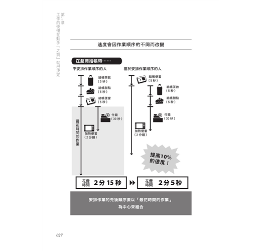 舉例來說,在超商結帳時,就要試著組合各種作業順序,以期用最快的速度完成結帳。假設你在超商買了便當、茶飲、甜點,「加熱便當」是最花時間的作業,因此你要把便當放在購物籃裡離店員較近的靠邊位置,讓店員可以先拿到便當加熱。這樣店員就會先結便當、加熱,加熱便當的過程中再結帳其他商品。便當加熱完成時,結帳的作業也完成了。