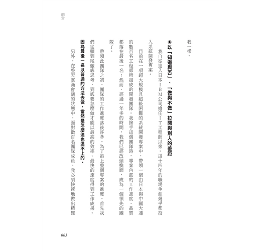另外,在整天塞滿會議的狀態中,面對數百名團隊成員,我必須快速地做出精確的指示,以期立刻解決每天發生的問題。在這樣的狀態之下,為了使自己以及數百人團隊能以最快的速度工作,我們實踐了無數的工作技巧,藉此大大地改變整個團隊,而今,我們已經成為一個無論工作進度或工作成果都排名第一的團隊了。